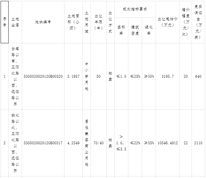 據(jù)了解,這三宗土地分別為530502002012GB00316號、530502002012GB00317號和530502002012GB00320號地塊,總面積為11.6013公頃,總起始價24030.4051萬元。三宗土地均位于白塔路以南、正陽北路以西、遠(yuǎn)征路以東,整體搭配出讓。